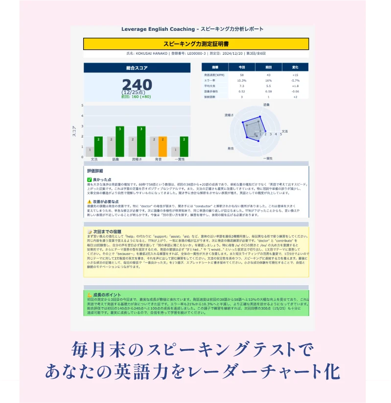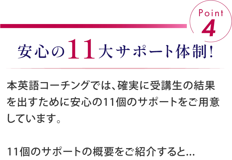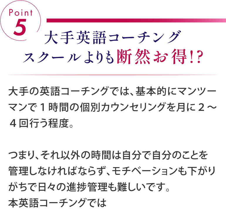 英語コーチングとは、あなた専属のパーソナルコーチがつき、オーダーメイドの学習設計から日々の学習管理まで二人三脚で伴走してくれる個別学習プログラムです。