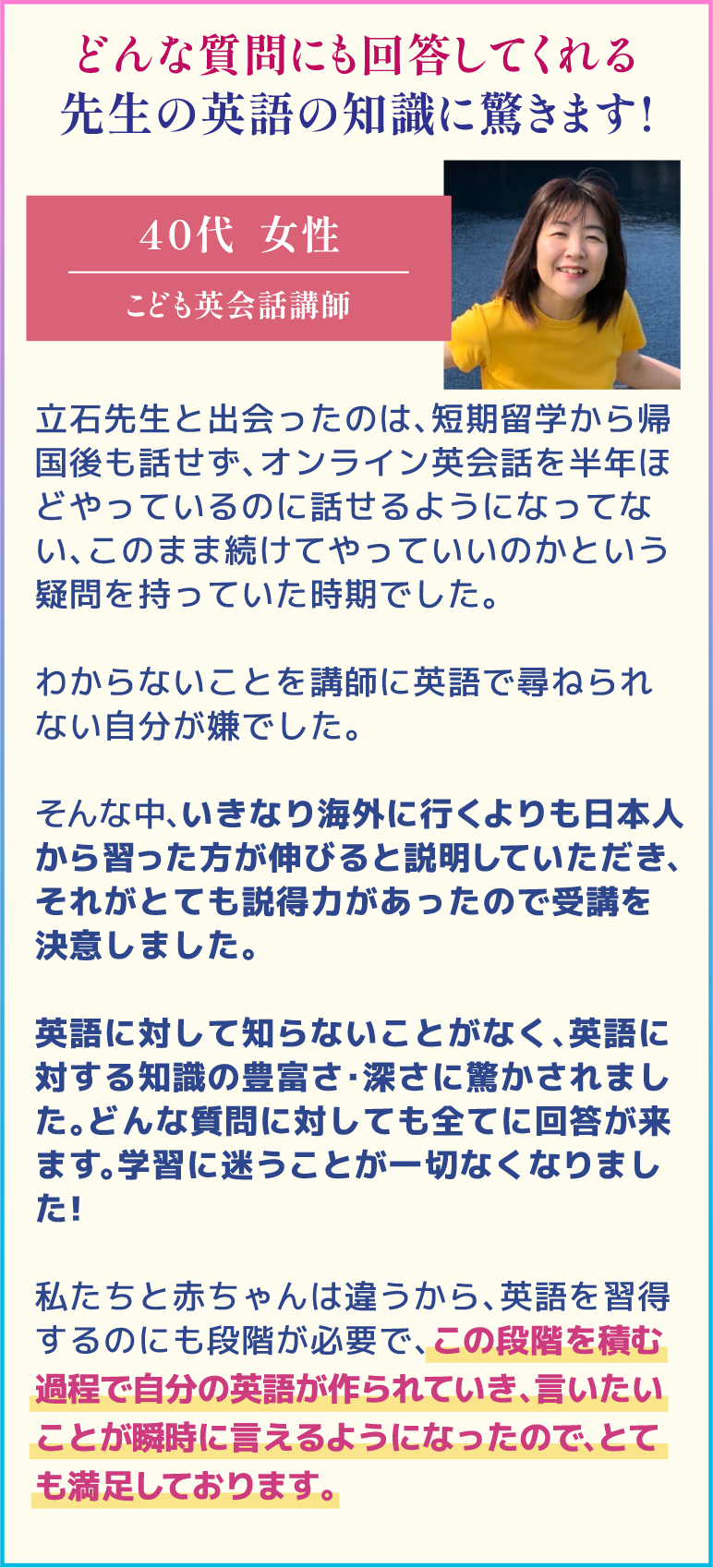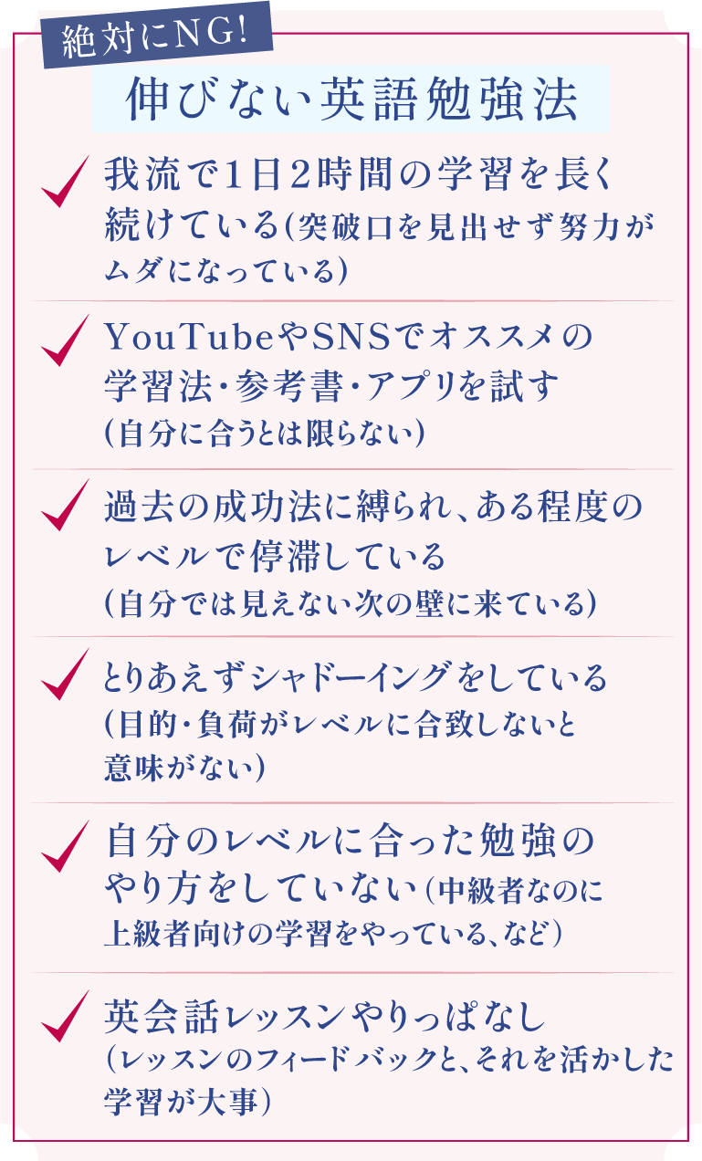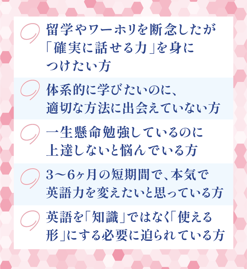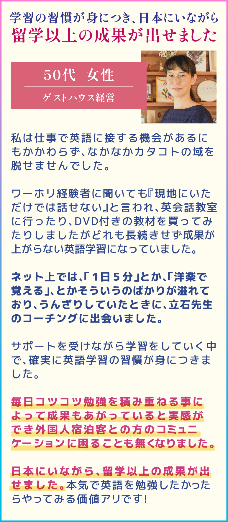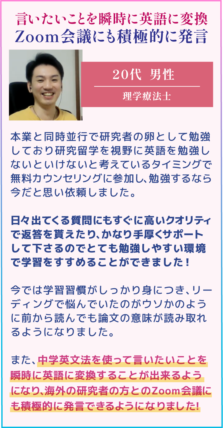 これまで、英語を勉強しても英語力が上がらないと悩んでいた人を100名以上サポートする実績を持つ。