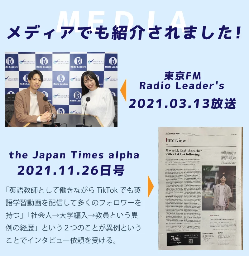 高校教師時代は予備校や塾などに通っていない生徒でも、TOEIC学年平均約700点を達成。また、高校生でTOEIC満点、海外大学に進学、ディベートコンテスト優勝、英検1級等の指導実績を作る。