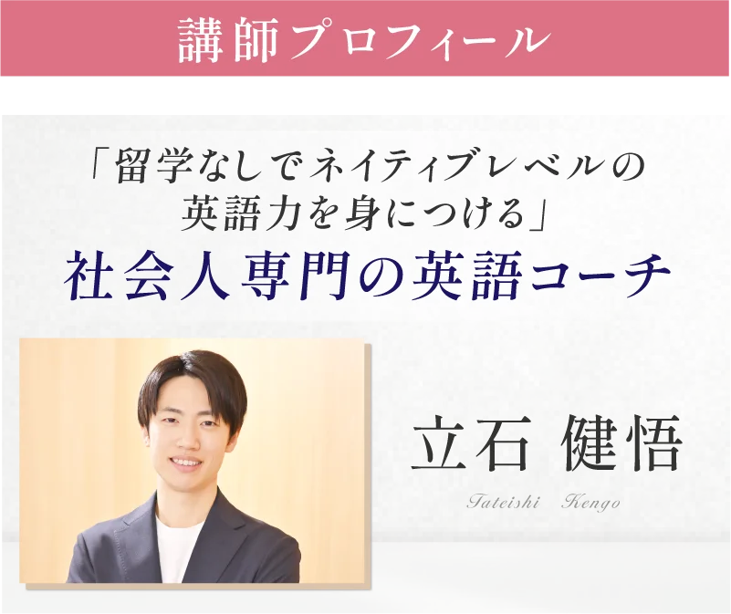現在は独立を果たし、社会人向けに知識を“使える英語”へ変える実践トレーニングを行うことで、短期間で“英語学習の壁”を突破し、長期的に英語力を定着させる『立石 健悟』独自の英語コーチングを提供している。