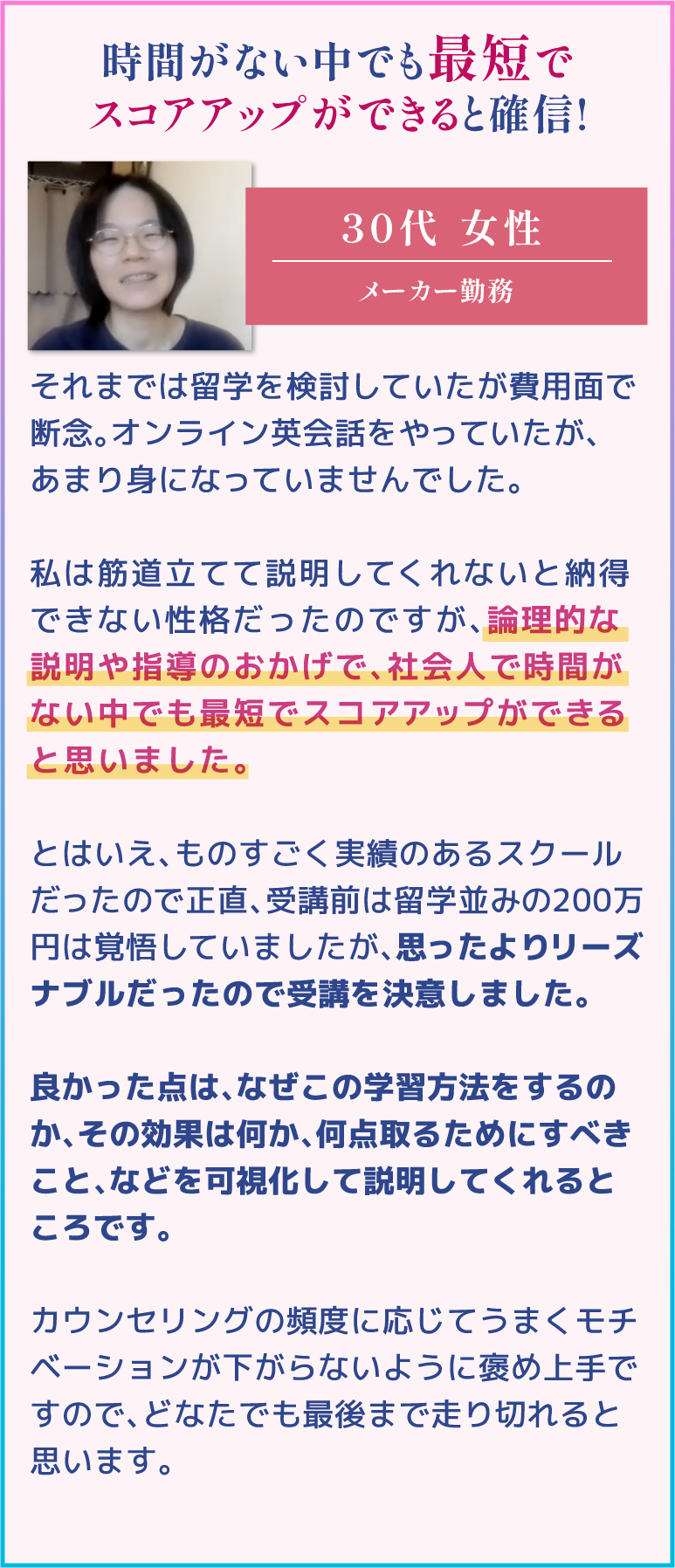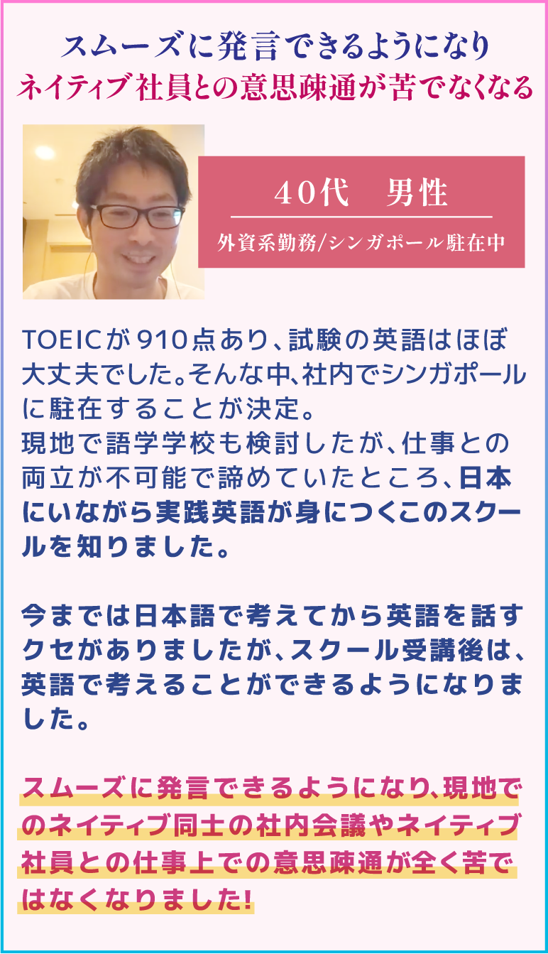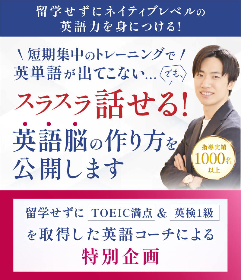 その経験から、英語初心者からでも留学なしでTOEIC900点台、ネイティブレベルの英会話力へ導く英語攻略法を確立する。