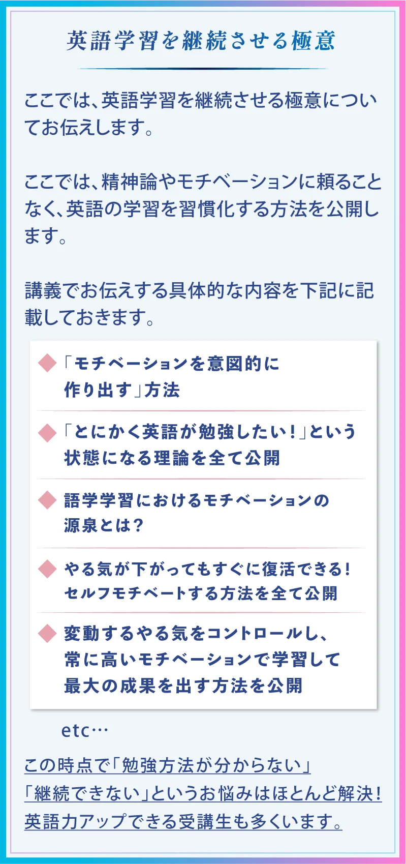 自身も大学在学中は英語が苦手だったが、克服するために様々な英語学習法を試す。その中で「第二言語習得理論」に出会い、関連文献・論文を100以上読破し「留学せずに」英語を習得。